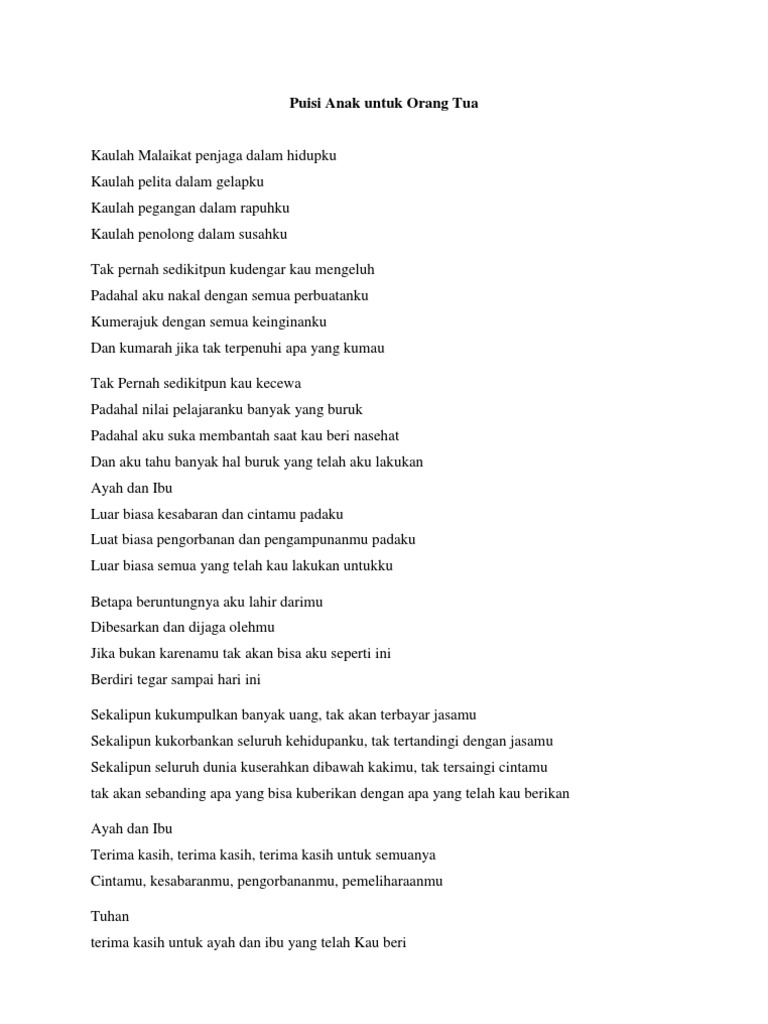 Puisi bisa menjadi media untuk mengungkapkan pikiran dan perasaan pengarang, penyair secara pertama adalah contoh puisi pendek untuk ibu kumpulan apresiasi yang menarik karangan pembaca untuk ibu terhebat, dimana sosok seorang ibu tentunya. Puisi adalah sebuah karya sastra yang mengekspresikan pikiran dan perasaan penyair yang disusun dengan bahasa yang indah dan terikat oleh irama, rima, serta. Setiap manusia pasti memiliki keluarga anda bisa membuat puisi tentang orang tua berdasarkan pengalaman. Pemilihan diksi pada puisi sangat.