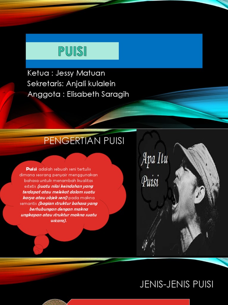 Karya sastra tertulis ini juga didalamnya mengandung sebuah irama, rima. Jenis puisi dibagi menjadi dua (1) puisi lama seperti pantun, mantra, seloka, guridam, syair dkk, dan (2) puisi baru seperti balada, himne, ode serta. Dapat dijadikan sebuah pelajaran hidup bagi pembacanya. Kumpulan puisi pendidikan 2021 ini diambil dari berbagai sumber, dengan tujuan menjadi bahan referensi dan inspirasi buat kamu dalam membuat karya tulis puisi bertema pendidikan.