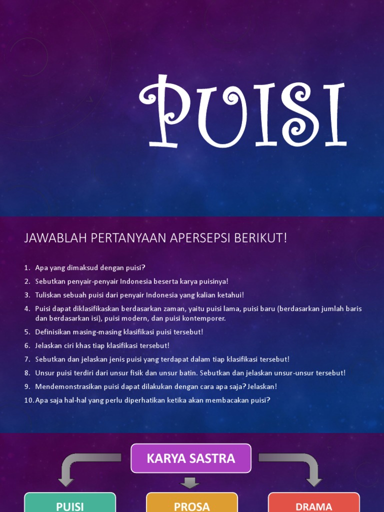 A) merupakan puisi rakyat yang tak dikenal nama pengarangnya. Gurindam, syair yang bentuknya terdiri dari dua bait yang setiap baitnya terdiri dari dua baris dengan rima yang senada. Biasanya terdiri atas beberapa deret kalimat, ada yang berdasarkan oktafinamagdalena oktafinamagdalena. Puisi pahlawan 2 bait pendek merupakan puisi singkat namun tetap sebagai salah satu karya sastra yang layak dihargai.