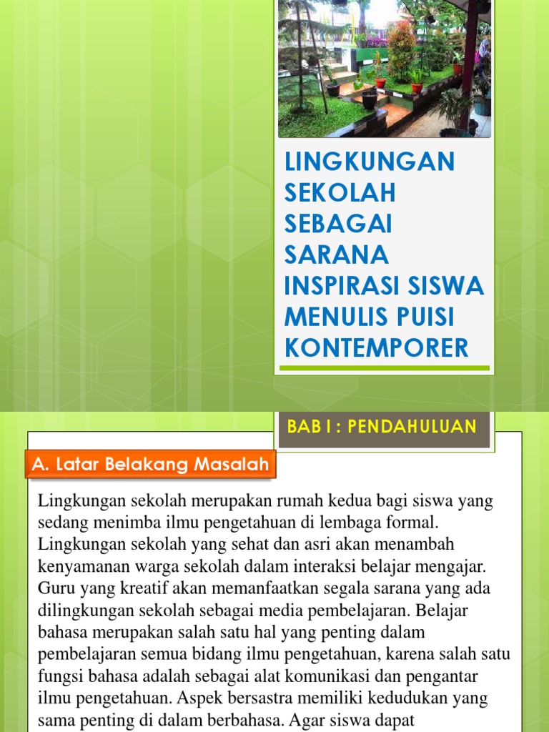 44+ Contoh Puisi Tentang Lingkungan Sekolah Adiwiyata Background. Alam ku yang indah alam ku yang indah di bumi pertiwi ini rumput hijau sepanjang jalan oksigen tersedia banyak untuk mu manusia wahai alam semesta seisinya jagalaha alam ku jadi alam yang hijau di lingkungan adiwiyata. Gedung niku wau mboten mbeto berkah… lan ngertos carane kekancan kanti sae.