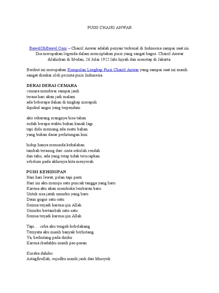 50+ Contoh Puisi Pendidikan Karya Chairil Anwar Gif. Penasaran seperti apa kumpulan puisi karya chairil anwar yang sangat populer dan melegenda itu? Puluhan karyanya selalu mendapat apresiasi yang baik dari pembaca dan masyarakat.