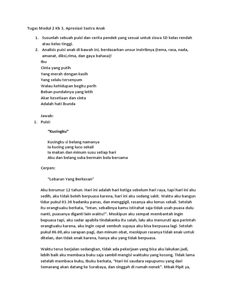 Semoga membuat kamu semakin mensyukuri anugerah dari allah, tuhan pencipta. Pembagian itu di antaranya sub materi diksi, pengimajian, gaya bahasa, isi puisi, dan jenis puisi. Puisi merupakan karya sastra dalam bentuk tulisan yang mengandung rima, irama, ritma dan lirik pada setiap baitnya.kami akan memberikan beberapa contoh puisi untuk anak sekolah dasar (sd) yang mampu kamu jadikan sebagai deskripsi mengerjakan dengan berbagai tema puisi anak. Berikut jenis jenis puisi beserta contohnya.